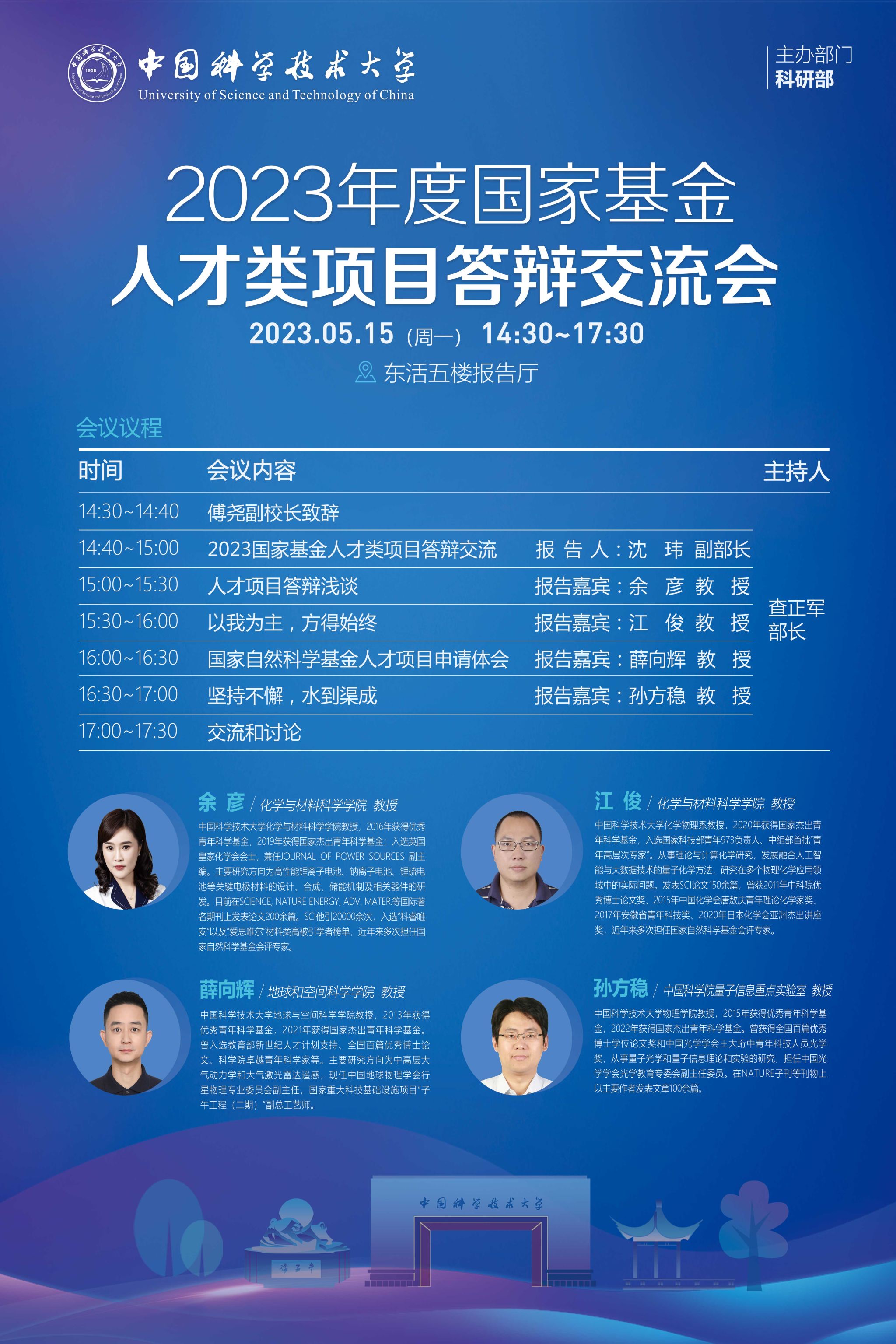 为做好我校2023年度国家自然科学基金杰青、优青等人才类项目答辩工作,提升答辩质量,学校将于5月15日组织召开“天启网投2023年度国家基金人才类项目答辩交流会”。本次会议科研部特邀多领域专家解读人才类项目答辩要点及分享相关经验等。