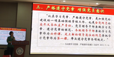 在党课的最后,刘红运强调全体党员应该认真学习党章,严格遵守党章,增强党员意识,这是全党同志的应尽义务和庄严责任。具体到每个人,需要我们在自己的岗位上履职尽责、谋事干事,全力以赴而不只是尽力而为,解决问题而不只是完成任务,创新方法而不只是机械执行。提及增强党员意识的方式方法时,刘红运教授强调:学习和教育是基础,管理和监督要跟上,尊重和保障不可少,实践和修养是途径。