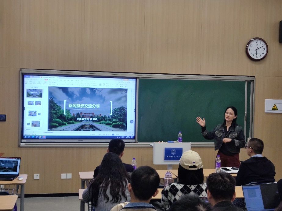 培训的最后一个环节是由学院行政办公室负责宣传工作的朱博涵老师与大家交流新闻摄影体会。朱博涵以直观生动的方式展示新闻照片的“反面典型”,逐一分析其中存在的常见错误并给出如何改进的建议。他从“定主题、突人物、稳镜头、调参数”这四个关键点展开,以优秀新闻照片为范例,详细介绍新闻摄影的侧重点和如何提升新闻摄影质量。