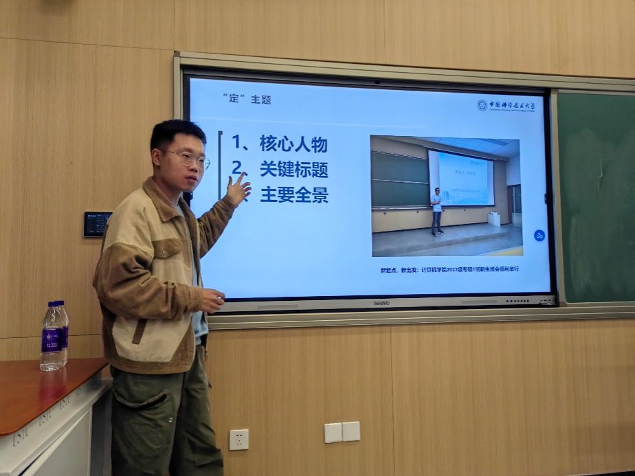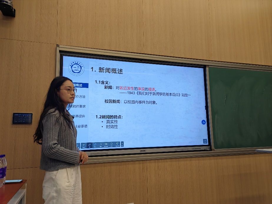 随后,校记者团副团长赵彩萍同学针对校园新闻写作做交流分享。赵彩萍从新闻的定义出发,对新闻内容、分类做了简单概述。她重点分享了新闻稿写作中在标题、导语、主体、结尾等关键环节的写作技巧。最后,在如何提升写作修养上,她建议大家“多读、多思、多练、多积累”。赵彩萍的新闻写作分享条理清晰,课件制作精良直观,讲授时结合多篇优秀新闻报道,理论联系实际,加深了参训成员对新闻写作的理解。