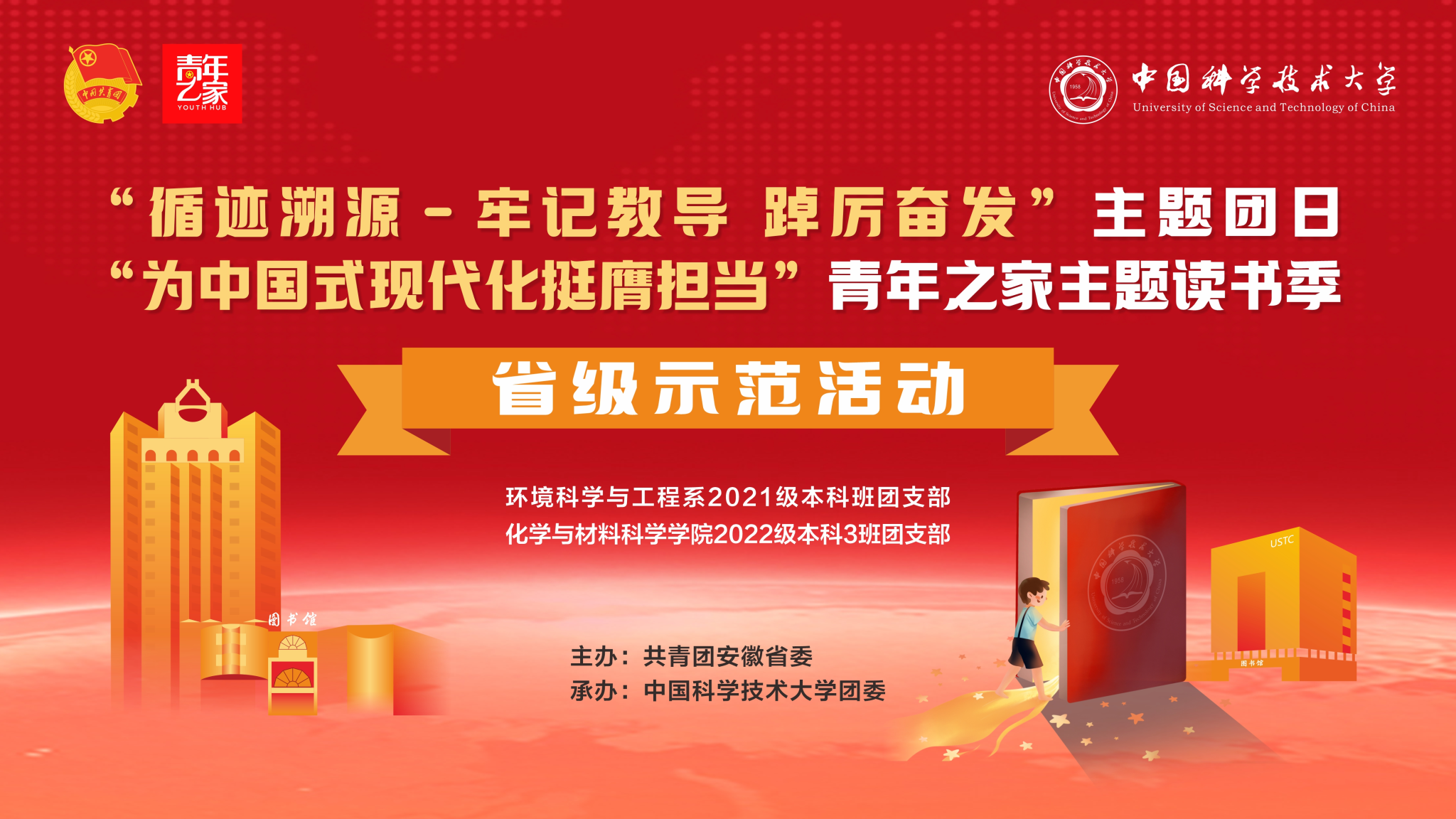 在习近平总书记考察中国科大八周年之际,4月24日下午,由团省委、校团委主办,“循迹溯源—牢记教导,踔厉奋发”主题团日暨“为中国式现代化挺膺担当”青年之家主题读书季省级示范活动在东区新图书馆四楼报告厅成功举办。团省委组织部负责同志、校团委书记千坤、环境科学与工程系党总支书记张文真,相关院系团委负责同志共同参加活动。活动由环境科学与工程系2021级本科班团支部书记阿不拉江·图尼亚孜同学主持。