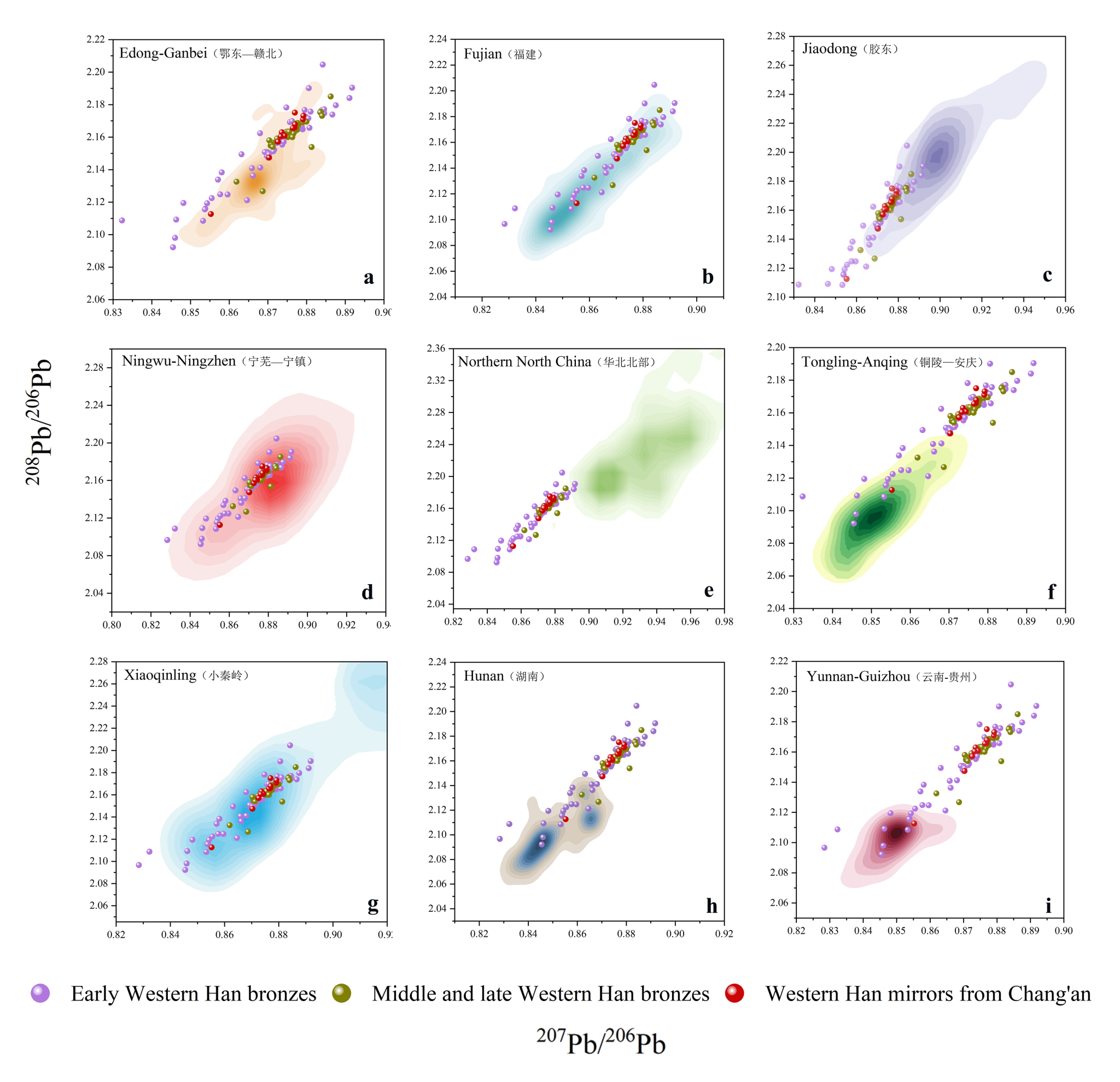图三 汉代青铜器和各地区铅矿的铅同位素核密度图