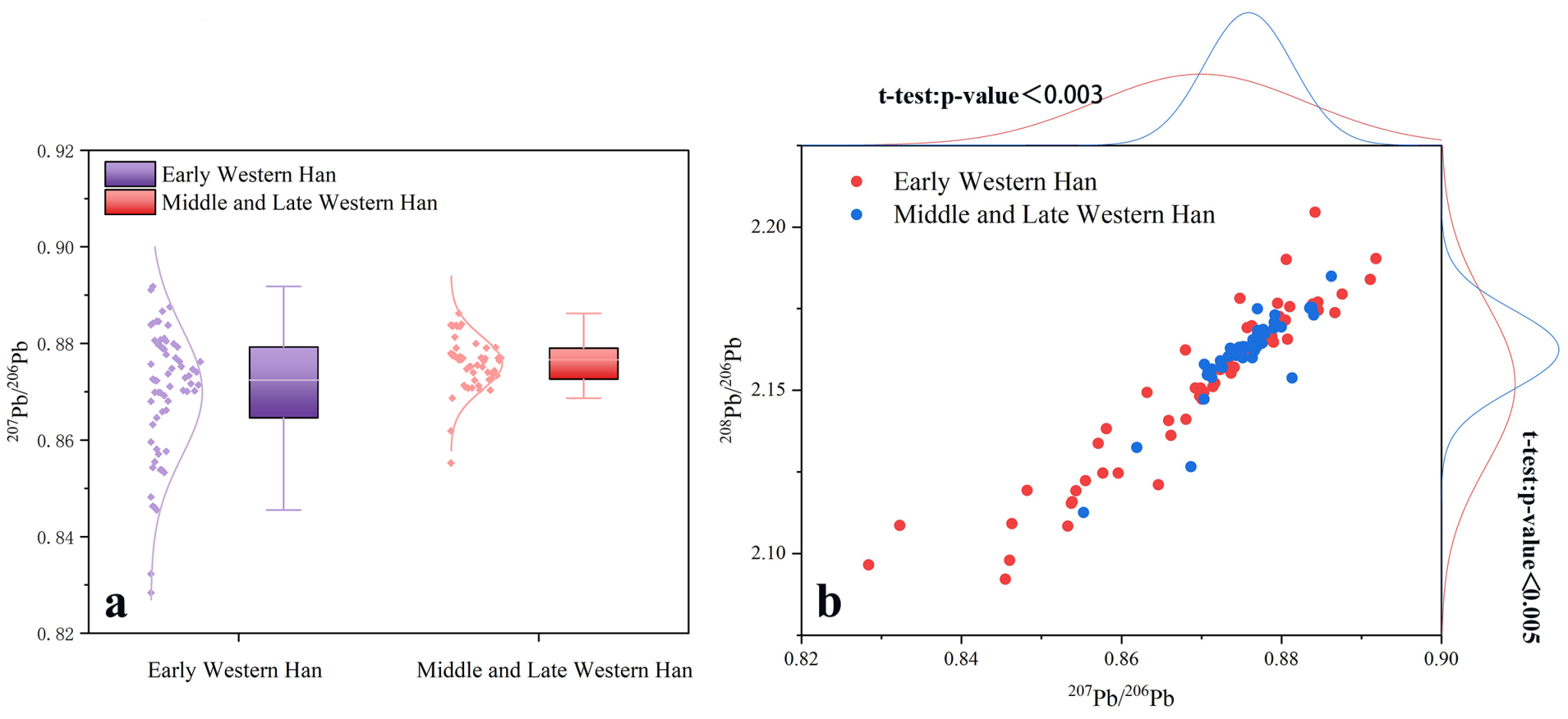 图二 西汉早期和中晚期铜器铅同位素的箱式图和组边际图