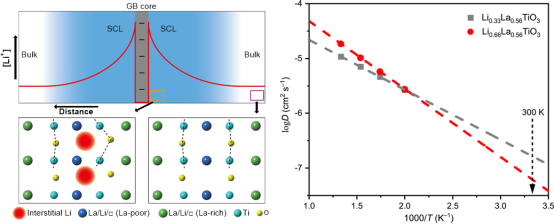 马骋教授团队发挥了球差校正透射电镜具有原子级分辨率的优势,以Li0.33La0.56TiO3这一经典固态电解质的晶界作为研究对象,揭示了空间电荷层对其离子传输的影响。在文献报道中,研究者普遍认为该材料之所以会具有过大的晶界电阻,是因为空间电荷层在晶界附近形成了锂离子浓度极低的区域,从而限制了离子迁移效率。不同于这一认知,马骋教授团队通过球差校正电镜观测发现晶界附近的锂离子浓度反而高于材料中的平均水平,并且精准确定了这些多余锂离子在晶格中的位置。