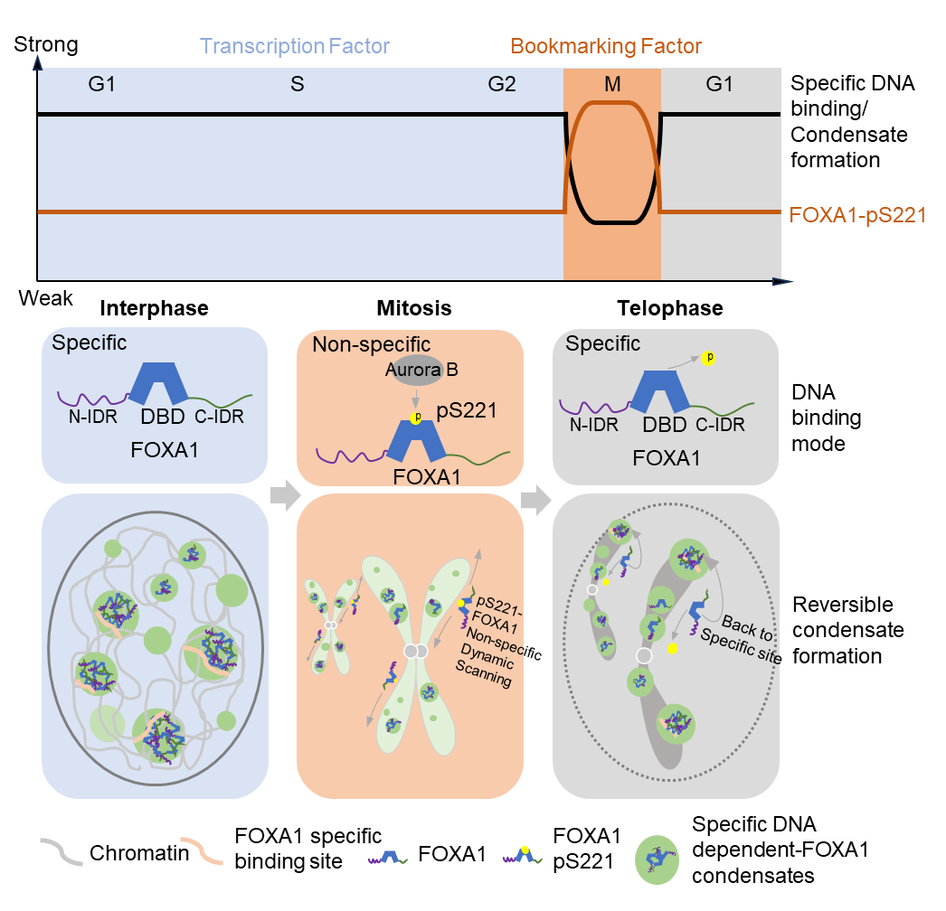 FOXA1蛋白是一个重要的的先锋转录因子(pioneer transcription factor),同时它也是一个在有丝分裂期结合在染色体上的书签标识因子,(bookmarking factor)”(Nat Rev Mol Cell Biol.20(1):55-64., 2019)。作为先锋转录因子,FOXA1在胚胎发育过程中率先激活转录沉默的异染色质,启动靶基因的表达,从而促进组织和器官的发育和分化。作为书签标识因子,尽管在细胞有丝分裂期过程中FOXA1失去了大量DNA序列依赖的特异性结合,它仍然能够以非特异性结合模式驻留在染色体上,并动态扫描染色体DNA以确保有丝分裂完成后相关基因的转录得以迅速重启(Genes Dev.27(3):251-260., 2013)。然而,FOXA1从DNA序列依赖的特异性结合转变为非特异性结合的调控机制及其书签标识功能的分子机理是领域内尚未解决的重要科学问题。