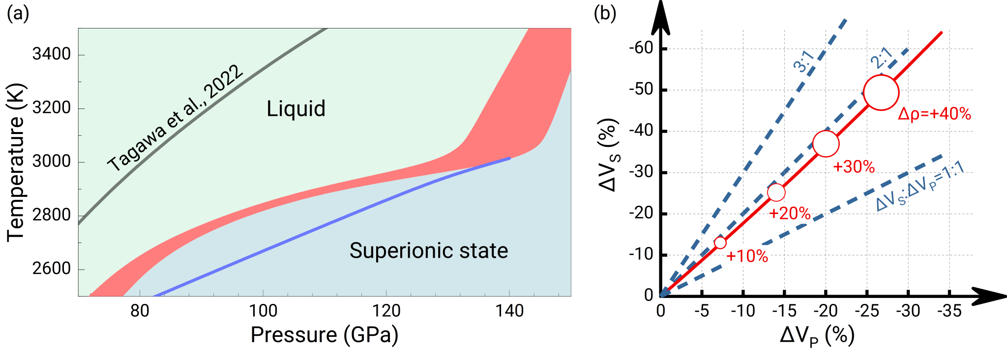研究团队采用“第一性原理计算+机器学习“的方法对FeHx在核幔边界条件下的稳定性和热弹性性质开展了研究。结果表明,在核幔边界的温压条件下,FeHx能够以超离子态的形式稳定存在(图1a):Fe原子在其晶格平衡位置附近振动,类似于固体,而H原子能够像流体一样在晶格间扩散。