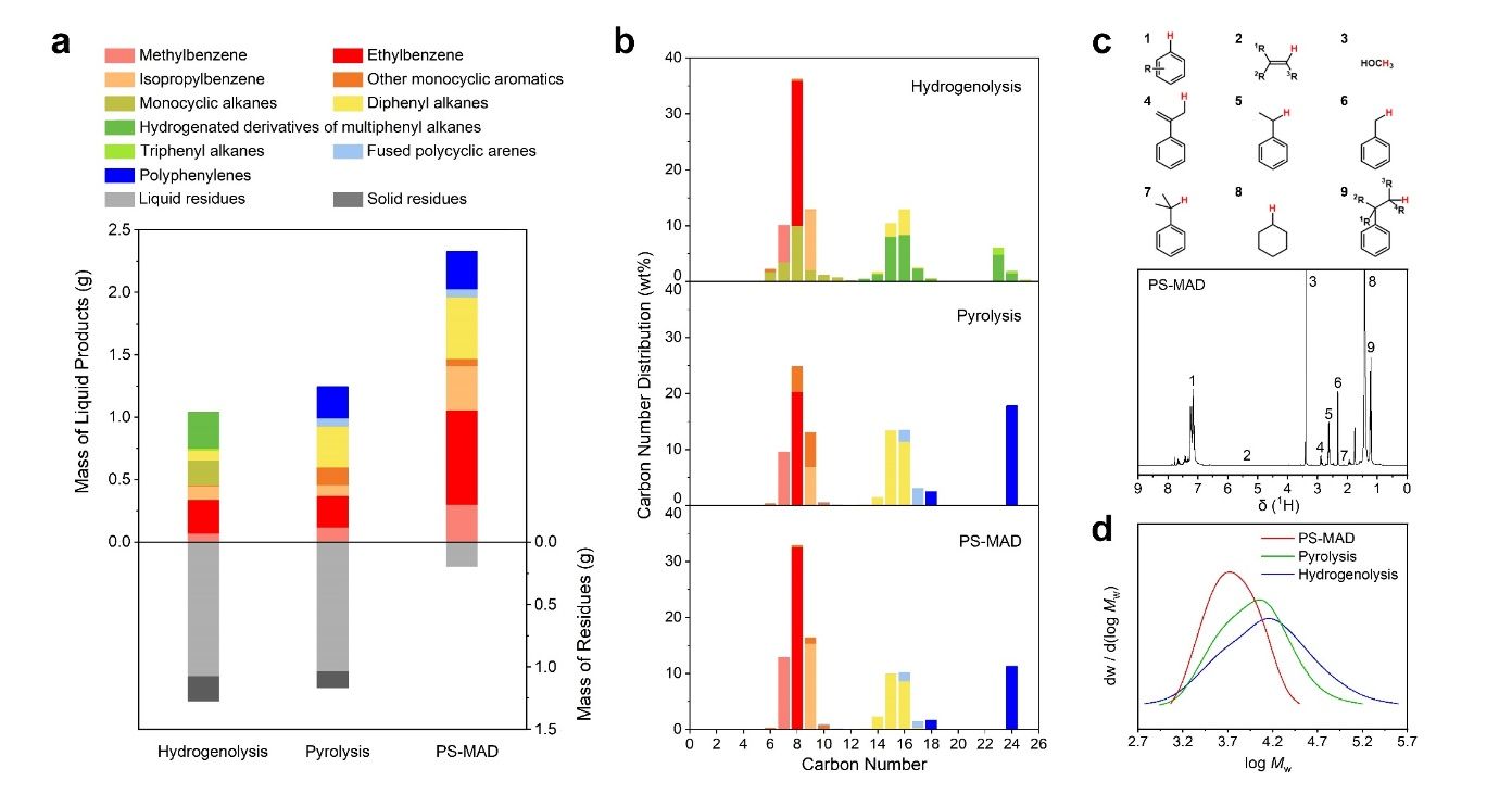 图1. 聚苯乙烯氢解、聚苯乙烯热解以及甲醇辅助聚苯乙烯解聚的反应概况与产物解析