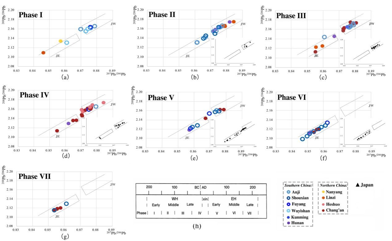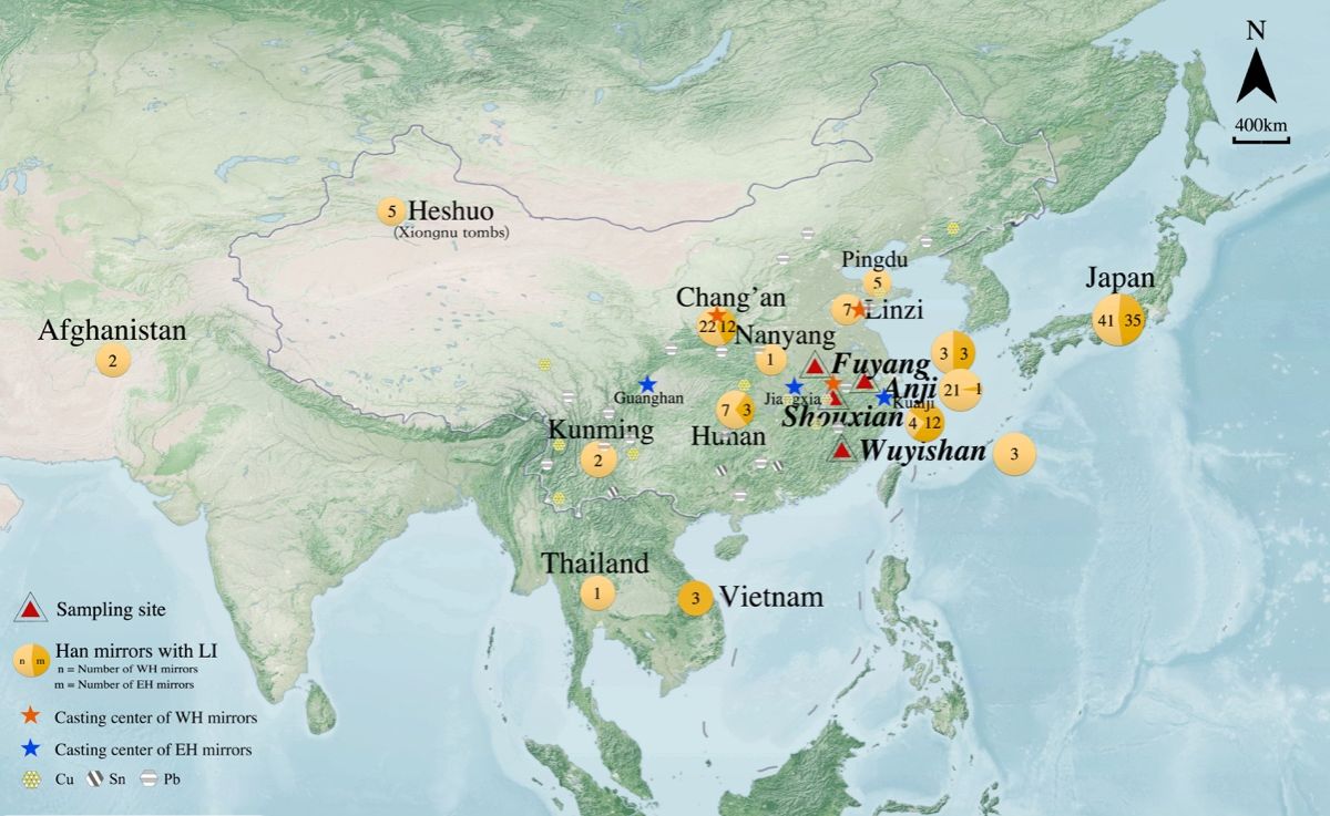 铜镜在汉王朝本土得到普遍使用的同时,也承载着汉文化,沿丝绸之路和海上丝绸之路广泛传播至朝鲜半岛、日本列岛、印度半岛、西伯利亚、中亚等地,是连接欧亚大陆和东亚各国的重要古代实物资料。日本学界自20世纪70年代就开始对日本出土汉镜的铅同位素溯源研究工作,结果表明日本出土西汉镜与东汉镜铅同位素数据差异显著,研究者基于此建立西汉镜使用“华北铅”、东汉镜使用“华南铅”的简化模型。这一模型也多作为分析基础用于探讨中国境内外如长安、新疆、阿富汗、泰国等地出土汉镜的来源。因此,中国出土汉镜是否符合这一简化模型,亟待开展系统性科技考古分析工作。