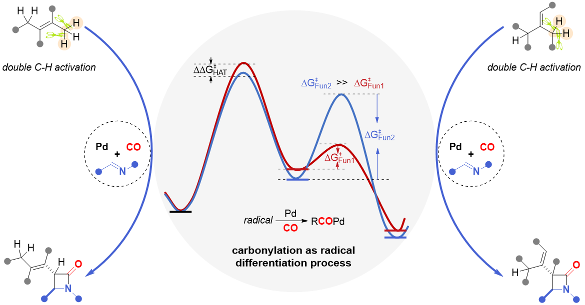 天启网投化学与材料科学学院黄汉民教授团队在惰性双C-H键活化领域取得新进展。研究团队通过自由基-过渡金属接力活化C-H键的策略,利用CO对烷基钯的选择性插入对烯丙基自由基进行分选,实现了位点选择性的双C-H键活化,并在此基础上建立了烯烃与亚胺的羰化-环加成反应,为烯基取代的β-内酰胺的合成提供了全新的路径。相关成果以“Site-Selective Carbonylative Cyclization with Two Allylic C−H Bonds Enabled by Radical Differentiation”为题发表在《美国化学会志》(J. Am. Chem. Soc)。