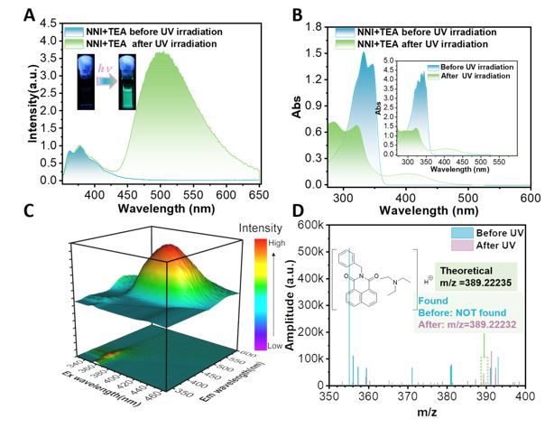 图2.萘酰亚胺和三乙胺混合体系光照前后的谱学特征