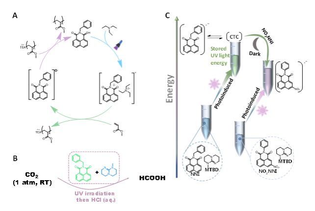 课题组将该体系成功应用于丙烯酸酯类单体的光诱导聚合,二氧化碳的光还原,以及光能存储及释放方面,通过在黑暗条件下将光照时储存的光能释放,使得原本需要光照才能进行的过程在黑暗条件下也能进行(图3)。根据作者推测,通过电子激发态形成溶液中稳定的基态复合物这种分子间相互作用模式不应该仅局限于酰亚胺和胺分子之间,很有可能是一种比较普遍但是未被关注的相互作用,有望于在更多的分子结构中被发现并且能够用于新的光化学反应。