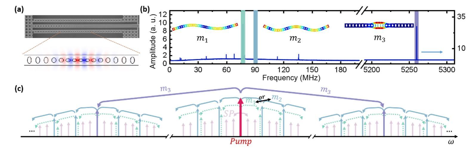 图1:(a-b)光力晶体微腔以及腔内的光学模式和机械模式;(c)微腔内光力频率梳产生的原理示意图。
