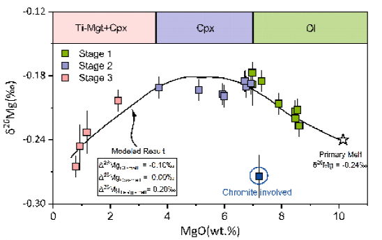 研究团队使用同位素质量平衡模型,估计了主要含Mg矿物橄榄石(Ol)、单斜辉石(Cpx)以及钛磁铁矿(Ti-Mgt)与熔体间表观分馏系数Δ26Mgmineral-melt。模拟结果表明,当Δ26MgOl-melt≈-0.10 ‰,Δ26MgCpx-melt≈0.00 ‰,以及Δ26MgTi-Mgt-melt≈0.20 ‰时,矿物结晶可以很好地解释样品中的Mg同位素变化(图2)。该研究的一个重要结论是,当使用幔源熔体的Mg同位素组成来约束其地幔源区组成时,需要考虑岩浆演化过程中分离结晶的影响。