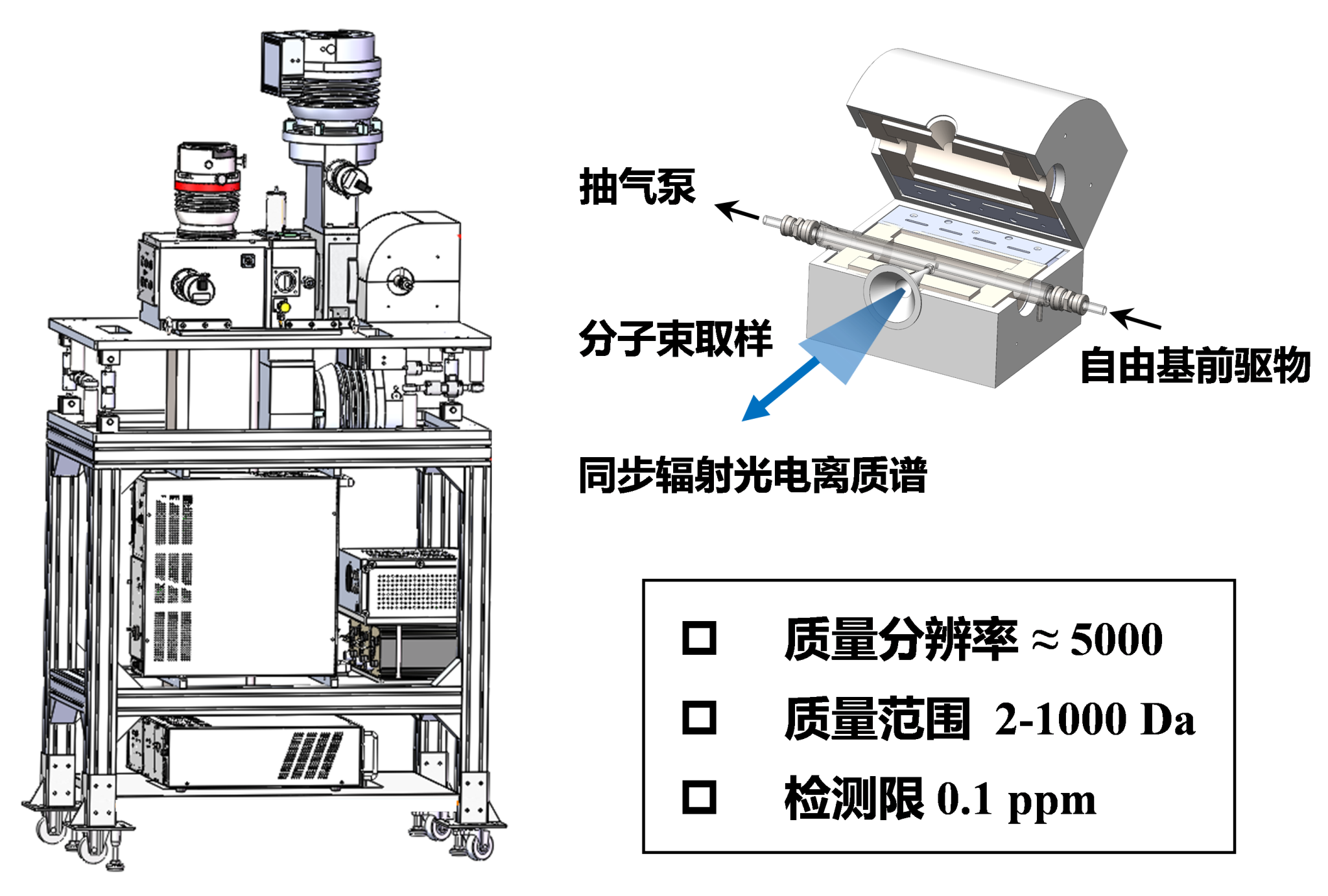 共振稳定自由基(RSR)是燃烧生成的碳质颗粒物中检测到的一类特殊的自由基,这种自由基通过电子非局域化获得更高稳定性和更长寿命,在颗粒物质量增长中扮演着重要的角色。由于实验手段的限制,对RSR反应机理的研究主要集中在初始的反应路径,对RSR如何实现颗粒物质量增长,没有直接的实验证据。针对这一问题,王占东研究团队在合肥光源原子与分子物理线站搭建了超声分子束取样−宽质量范围、高质量分辨、高灵敏同步辐射真空紫外光电离质谱实验平台(质量分辨率约5000,检测限约0.1 ppm,探测质量范围2-1000 Da),并通过在高温−低压流动管反应器中单独制备典型RSR来诱导反应,避免了火焰复杂反应的干扰(图1)。