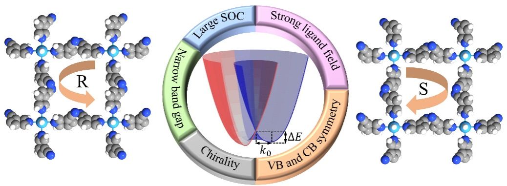 Rashba-Dresselhaus(R-D)效应是由空间反演对称破缺环境下自旋轨道耦合作用导致的一种自发自旋劈裂现象。它提供了一种电场调控自旋的有效方法,其优势在于不需要材料本身具有磁性,从而避免了低维磁性材料居里温度通常远低于室温的问题。因此,具有大R-D自旋劈裂的半导体对于制造电场控制的自旋电子器件具有极大的吸引力。然而,目前报道的二维R-D半导体主要是无机材料,且数量有限。此外,影响自旋劈裂的潜在因素和实现大自旋劈裂的一般性方法还有待探索。考虑到无机材料有限的可调性,研究人员将注意力转向二维手性金属有机骨架(CMOFs)。二维CMOFs是金属有机骨架家族的重要子类,近年来受到广泛关注,特别是在不对称催化和对映选择性应用中。R-D自旋劈裂出现的基本条件之一是打破空间反演对称。在这方面,缺乏反演和镜像对称的CMOFs提供了一个天然的设计平台。然而,在二维CMOFs中是否能够实现和如何实现显著的R-D自旋劈裂,以及手性与R-D效应之间的相关性仍不清楚。
