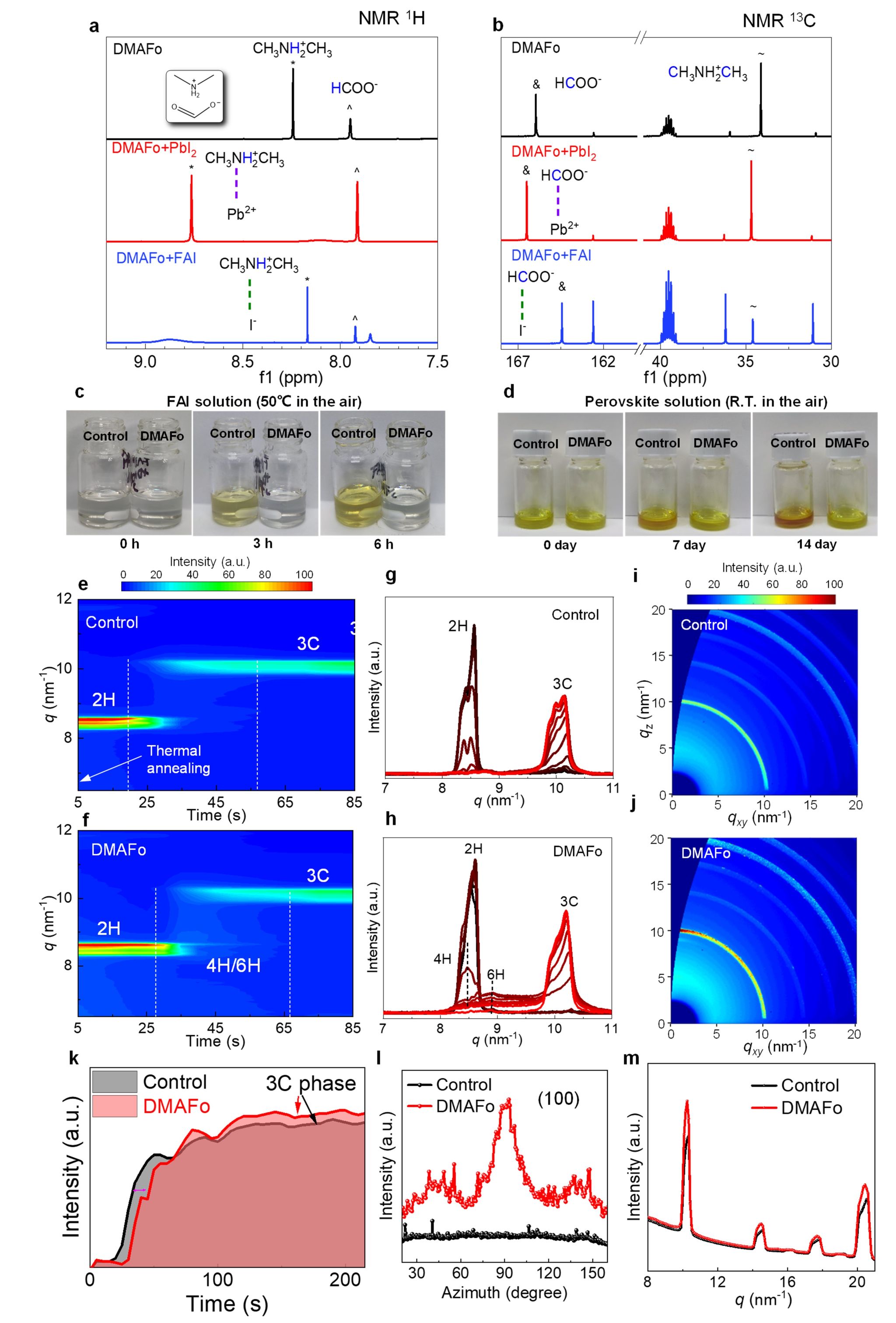 图1. (a, b)钙钛矿前驱体溶液的核磁谱图;(c, d)前驱体溶液的空气稳定性;(e, f)原位GIWAXS研究结晶过程;(g, h)GIWAXS剖面图;(i, j)钙钛矿薄膜最终结晶的GIWAXS图;(k)钙钛矿薄膜结晶GIWAXS强度积分曲线,(l)角度积分图,(m)径向积分图。