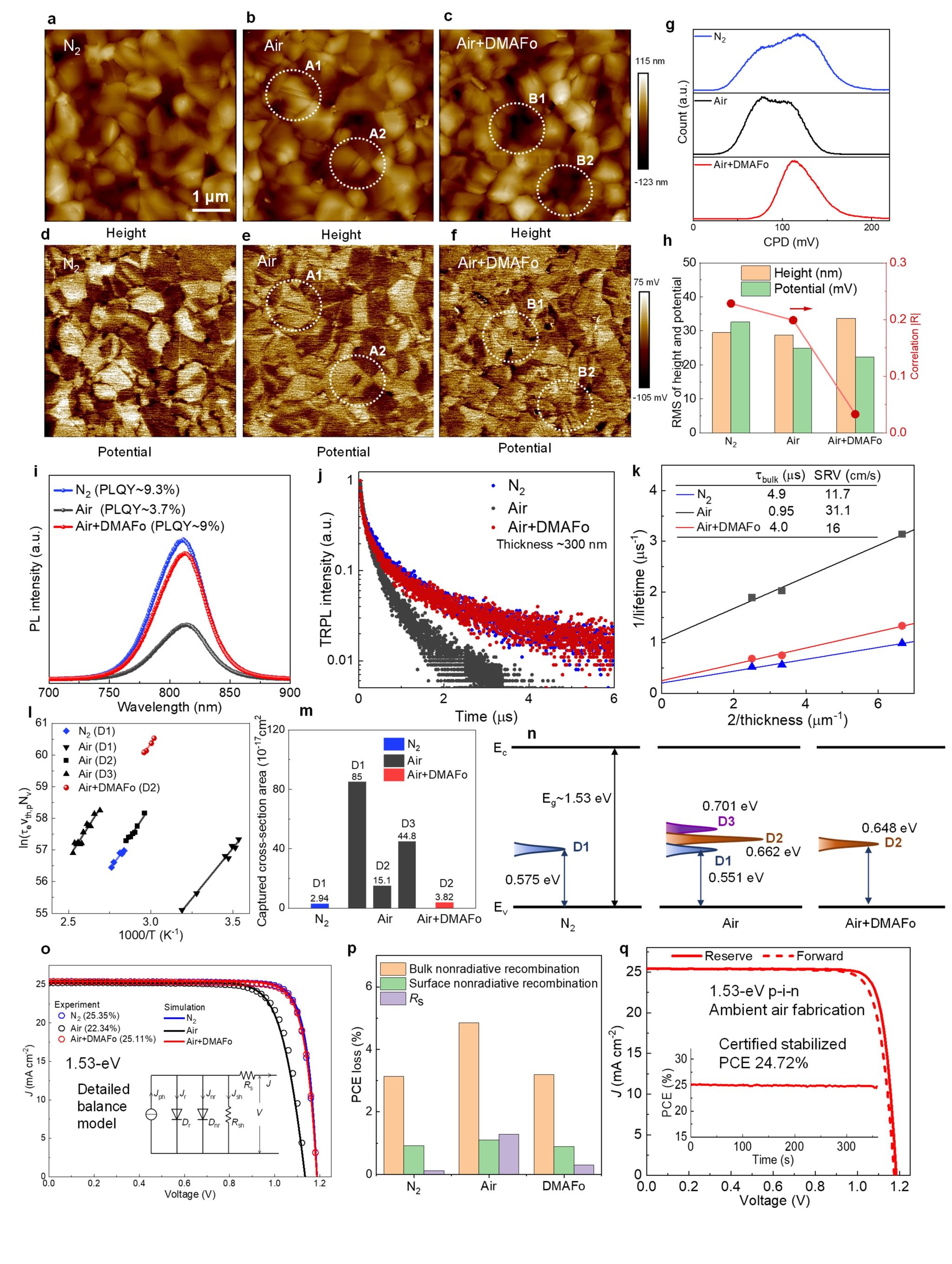 针对以上问题,中国科大徐集贤教授团队合成了一种离子液体型的“全过程”稳定剂——甲酸二甲基胺(DMAFo)。DMAFo的还原作用以及它与钙钛矿前体的配位键和氢键(图1.a-d)抑制了有机阳离子的去质子化和卤素离子的氧化,使钙钛矿溶液能够在空气环境和加热条件下长期储存。此外,这种保护作用可以延续至空气中的钙钛矿结晶过程,提高钙钛矿薄膜的结晶度(图1.e-m),降低局部孪晶产生和晶粒间表面电势无序度(图2. a-h),抑制缺陷诱导的非辐射复合(图2.i-k)。重要的是,综合缺陷表征与器件仿真模拟同时指出(图2. l-p):体相缺陷、而非表面缺陷的增殖是空气中制备的钙钛矿性能退化的主要原因。该发现证明了仅进行常规的表面钝化对于空气环境制备钙钛矿是不足的。基于以上进步,团队在空气环境中制造的1.53-eV p-i-n器件获得了25.4%的实验室最高效率和24.7%的稳态认证效率(图2q),接近氮气中制备的同种器件最好水平。同时,研究团队也确认了该技术在宽带隙钙钛矿材料中的普适性,对叠层器件的空气环境制备也具有良好推动意义。